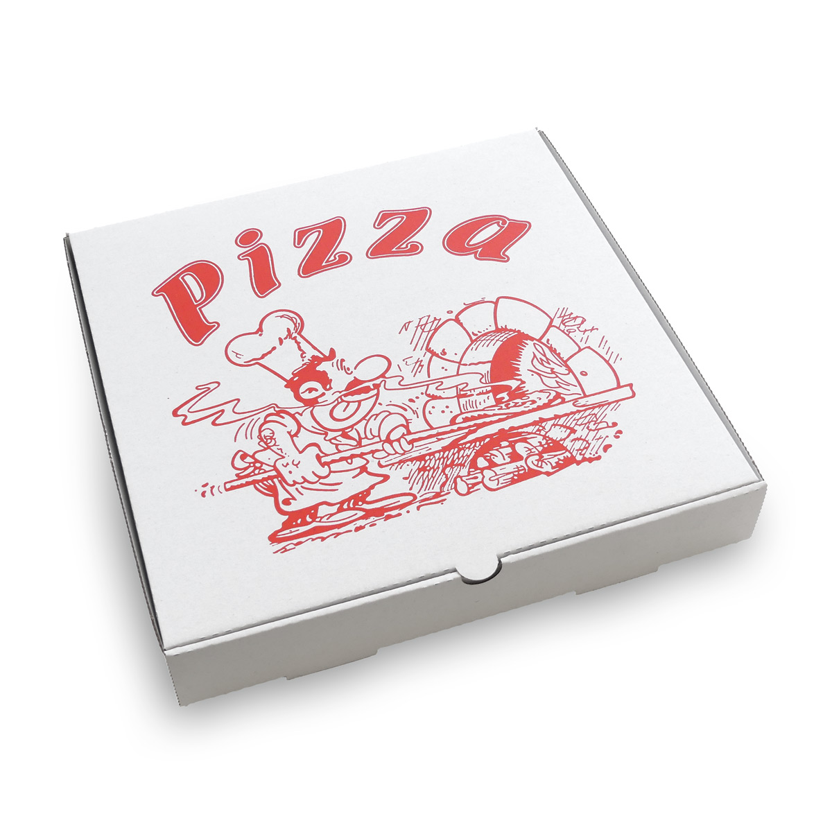 Cette boite à pizza de qualité standard avec impression générique « Pizzaiolo » est disponible dans les dimensions suivantes :
